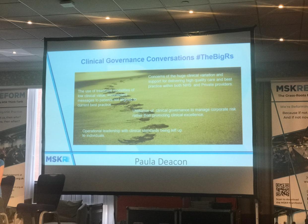 As is always the case at The Big R’s events, a vital perspective was sought from the patient contributors in attendance. Tina and Adrian provided excellent ideas on what would be most important from the patient to identify how governance is portrayed from a therapist and how this can promote confidence for a patient in a therapist.Morning break ensued, again spoiling us with refreshment of the highest order, and the conversations continued with fervour between exhibitors and delegates.